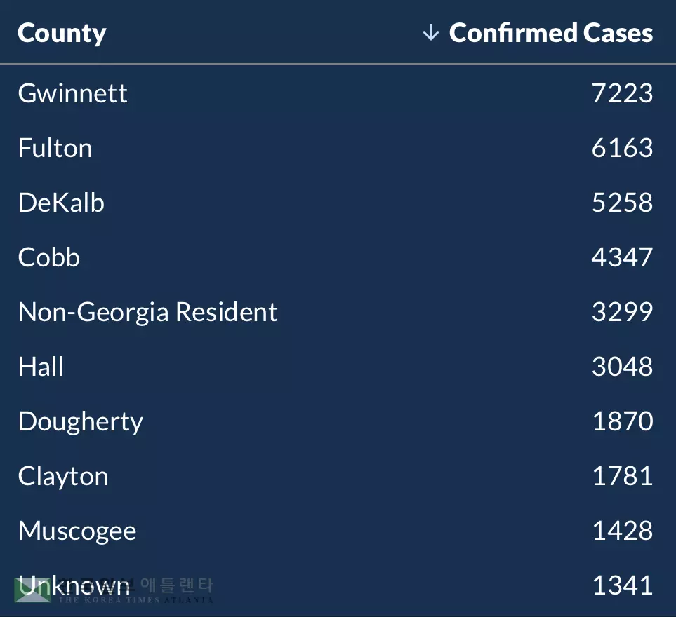 각 카운티별 감염자 수는 귀넷이 7,223명으로 가장 많았고, 풀턴 6,163명, 디캡 5,258명, 캅 4,347명, 홀 3,048명, 도허티 1,870명, 클레이턴 1,781명, 머스코지 1,428명, 미상 1,341명, 트룹 1,233명, 체로키 1,177명, 헨리 1,077명, 로운즈 1,040명이다.