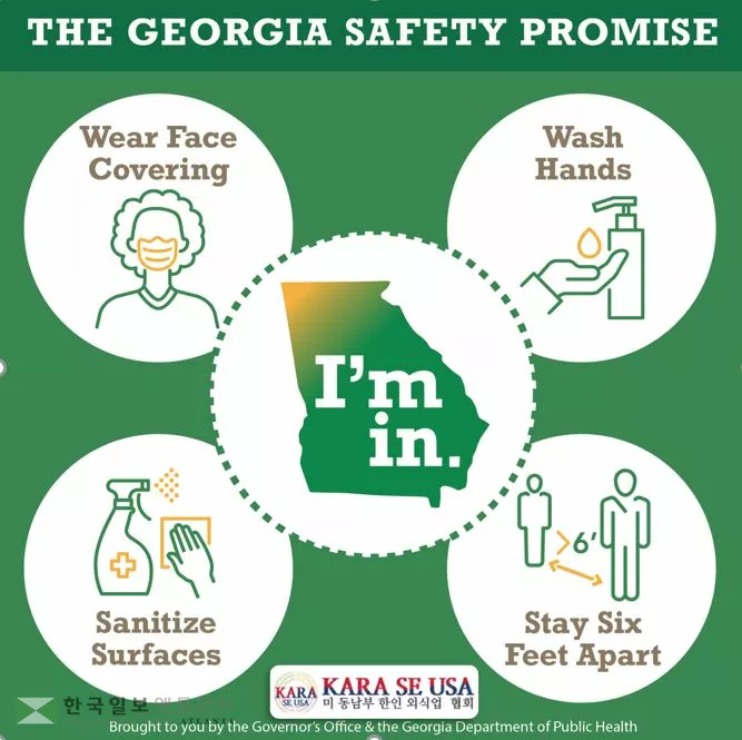 조지아 안전 약속은 소비자 신뢰를 심어주고, 코로나19 대유행 기간 동안 서로를 보호하기 위한 기본적이고 중요한 조치를 취하는 것으로 기업과 소비자가 서로와 자신을 돌볼 수 있도록 하고, 안전성 의도를 사업에 개방적으로 유지하도록 하기 위해 고안됐다. 내용에는 사회적 거리 두기 준수, 마스크 등 얼굴 가리개 착용, 청소 및 위생 관리, 손 세척 및 소독 등이 포함돼 있다.