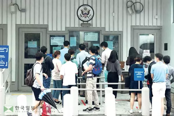 서울의 주한 미국 대사관이 코로나19 사태 속에 비자 발급 업무를 중단한 지 4개월여 만에 지난 20일부터 유학생 및 교환방문자 등을 대상으로 한 일부 비이민 비자 발급 업무를 재개했다. 이날 20일 오전 비자를 발급받으려는 신청자들이 서울 종로구 주한 미국대사관 비자 발급 창구에 줄을 서 있다. [연합]