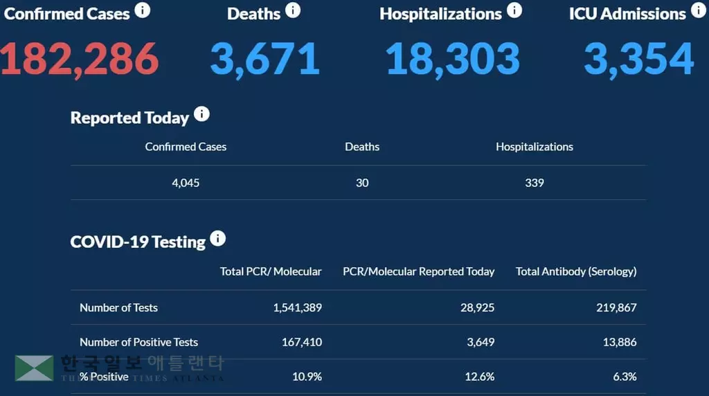 조지아주 보건부는 30일 오후 3시 현재 조지아주 코로나19 감염으로 인한 누적 사망자가 3,671명, 누적 확진자가182,286명이라고 발표했다. 확진자 치사율은 2.01%를 기록했다. 확진자 가운데 18,303명(10,04%)이 병원에 입원했으며 중환자실(ICU) 입원환자는 3,354명이다.