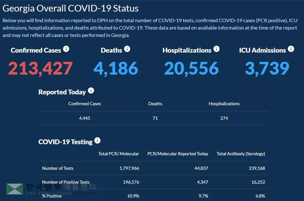 조지아주 보건부는 8일 오후 3시 현재 조지아주 코로나19 감염으로 인한 누적 사망자가 4,186명, 누적 확진자가 213,427명이라고 발표했다. 확진자 치사율은 1.96%를 기록했다. 확진자 가운데 20,556명이 병원에 입원했으며 중환자실(ICU) 입원환자는 3,739명이다.