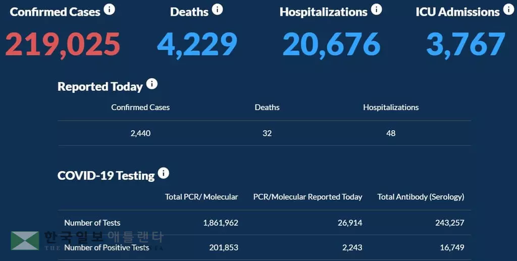 조지아주 보건부는 10일 오후 3시 현재 조지아주 코로나19 감염으로 인한 누적 사망자가 4,229명, 누적 확진자가 219,025명이라고 발표했다. 확진사 치사율은 1.93%를 기록했다. 확진자 가운데 20,676명이 병원에 입원했으며 중환자실(ICU) 입원환자는 3,767명이다.