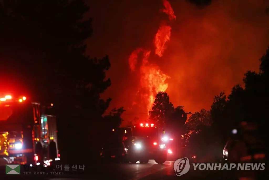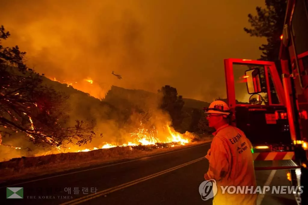 캘리포니아주 레이크휴즈에서 12일 소방관들이 산불 진화작업을 벌이고 있다. 산불은 1만에이커(약 40.4㎢)의 산림을 태우고 더 번지자 주민들에게 긴급 대피령이 내려졌다. 주민 대피령 내려진 캘리포니아 대형 산불 캘리포니아주 레이크휴즈 지역의 산불 현장에서 12일 출동한 소방관이 헬기가 물을 살포하는 광경을 지켜보고 있다.