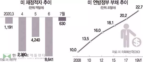 신종 코로나바이러스 감염증(코로나19) 확산에 따른 경기부양책과 셧다운(폐쇄)의 여파로 초래된 세수 감소로 미국 재정적자가 눈덩이처럼 불어나고 있다.
