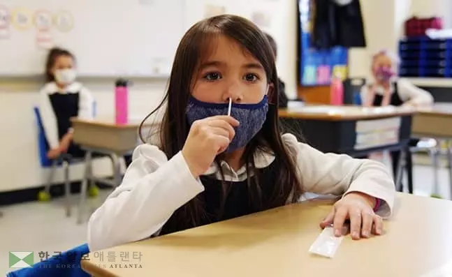 매사추세츠주 보스턴의 한 학교 교실에서 28일 학생들이 신종 코로나바이러스 감염증(코로나19) 검사를 위해 직접 면봉을 코 속에 집어넣어 검체를 채취하고 있다. 학교에서 코로나19 '자가검사' 하는 학생들