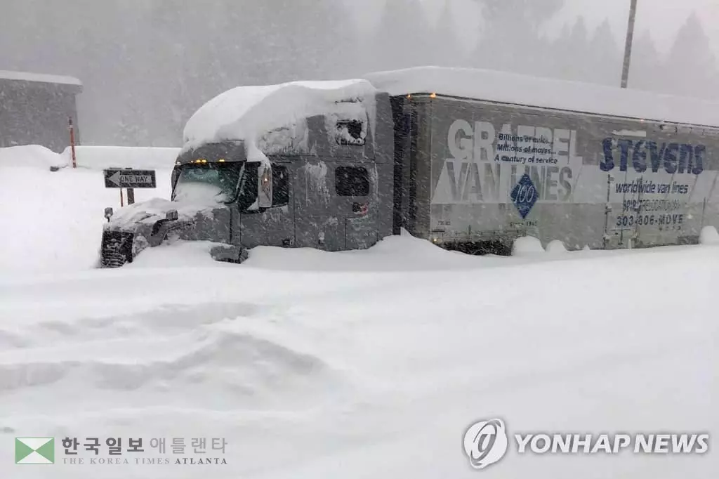 27일 캘리포니아주 모노 카운티에서 폭설로 인해 폐쇄된 395번 도로에 트레일러차량 한대가 발이 묶인 채 멈춰 서 있다. 이날 캘리포니아주 동부 시에라네바다 산맥 인근에는 폭설이 내렸고 중부 지역에는 폭우가 내렸다. [캘리포니아 교통국 제공]