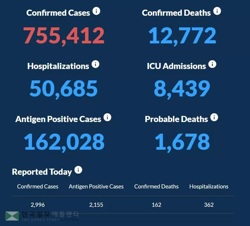 조지아주 보건부는 2일 오후 3시 현재 조지아주 코로나19 감염으로 인한 누적 사망자가 12,772명, 누적 확진자가 755,412명이라고 발표했다.