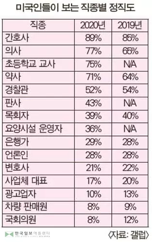 갤럽은 목회자와 함께 다른 직종에 대한 신뢰도도 함께 조사했다. 조사에서 목회자보다 높은 신뢰도를 보인 직종으로는 간호사, 의사, 초등학교 교사, 약사, 경찰관, 판사 등의 순서였다. 반면 미국인들이 목회자에 비해 신뢰도가 낮다고 판단한 직종은 요양 시설 운영자, 은행가, 언론인, 변호사, 사업체 대표, 광고업 종사자, 차량 판매원, 국회의원 순으로 나타났다..
