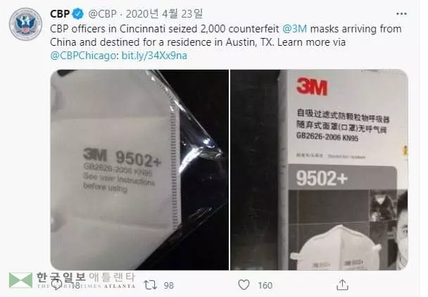 일례로 신시내티에서는 3M 마스크 1860 모델의 위조품을 담은 상자 21개가 압수됐다. 만약 진품이었다면 6만5,520달러 상당이라고 CBP는 전했다.
