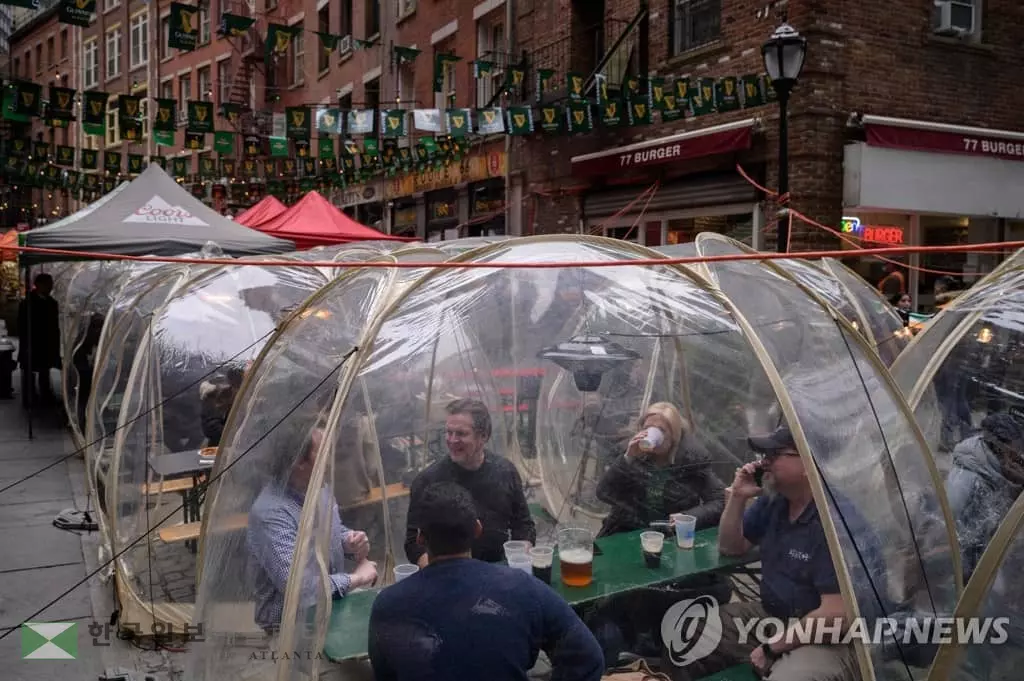 미국이 신종 코로나바이러스 감염증(코로나19) 재확산으로 비상인 가운데 '성 패트릭의 날'인 17일 뉴욕의 한 술집이 사회적 거리두기를 위해 옥외에 설치한 비닐 텐트 안에서 시민들이 술을 마시고 있다. 미 CNN 방송은 한동안 주춤하던 코로나19 신규 확진자 수가 14개 주에서 다시 증가세로 돌아섰다고 보도했다. <연합뉴스>