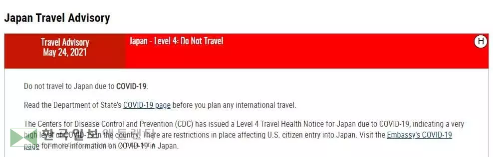 국무부는 "질병통제예방센터(CDC)는 코로나19로 인해 일본에 대한 여행 보건경보 4단계를 발령했다"며 "이는 일본에서 매우 높은 수준의 코로나19 상태를 보여준다"고 밝혔다.