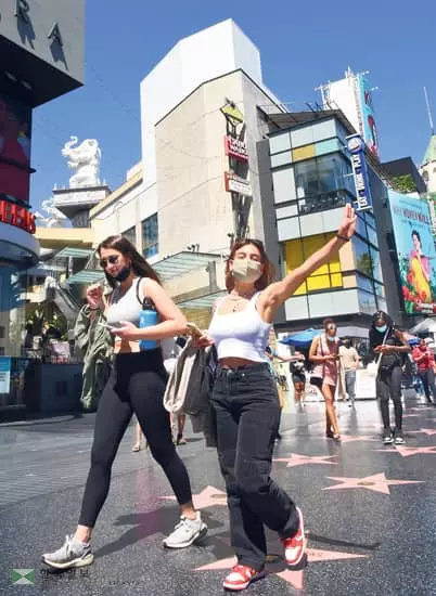 코로나19 확산세 급감으로 경제 완전 정상화를 눈앞에 두고 있는 가운데 LA의 대표적 관광지인 할리웃 거리도 돌아오는 관광객들로 활기를 되찾고 있다. 24일 할리웃 블러버드의 명성의 거리에 많은 방문객들로 북적이고 있는 가운데 지나가는 여성들이 마치 바이러스를 극복했다는 듯 활기찬 제스처를 취하고 있다.