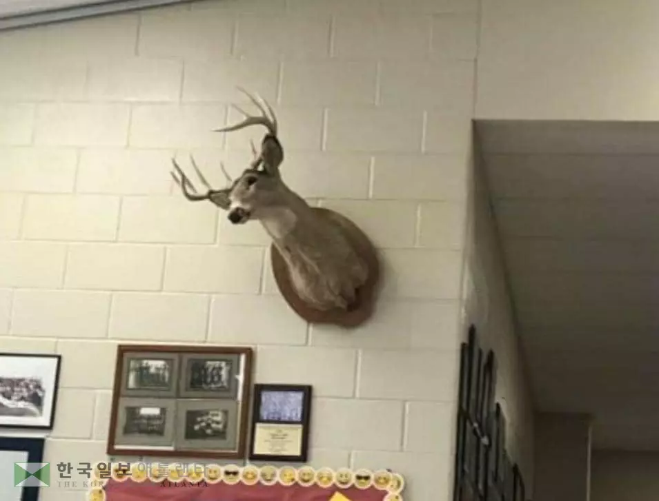 또 벽에 걸린 사슴 박제상을 옆으로 기울여 놓고 학교 앞에 '판매 중'이라는 입간판을 세워두었다.