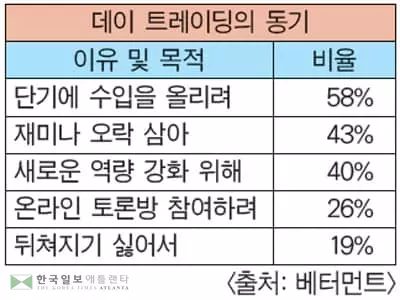 재미와 오락삼아 데이 트레이딩을 하기 시작했다는 응답자가 43%로 뒤를 이었고, 소셜 미디어와 같이 새로운 역량 강화를 위해 데이 트레이딩을 한 경우가 40%, 온라인 토론방 참여를 위해서가 26%로 나타났다. 19%의 응답자들은 시류에 뒤쳐지지 않기 위해서 데이 트레이딩을 시작했다고 답했다.