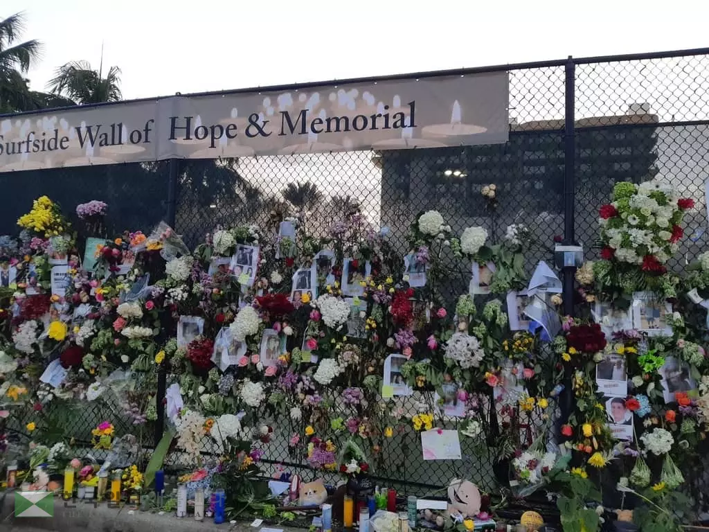 지난달 24일 부분 붕괴한 미국 플로리다주 서프사이드의 챔플레인타워 사우스 아파트 뒤편으로 철제 펜스에 추모의 벽이 마련돼 있다. 실종자 사진과 함께 구조를 기원하고 구조대를 응원하는 글들이 함께 붙어 있다. 플로리다 붕괴 아파트 뒤편에 설치된 임시 추모 벽
