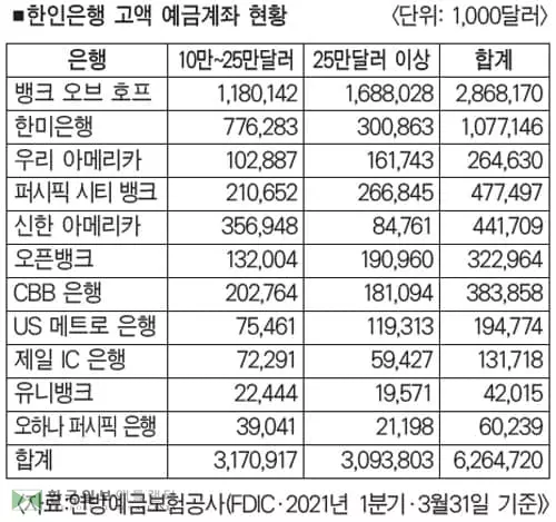 연방예금보험공사(FDIC)의 가장 최근 예금현황 자료에 따르면 2021년 1분기(2021년 3월31일 기준) 현재 미 서부지역에서 영업하는 11개 한인은행에 예치된 10만달러를 초과하는 고액 예금계좌의 규모는 62억6,472만달러로 집계됐는데 이는 전 분기인 2020년 4분기의 67억1,237만달러에 비해 6.7%(4억4,765만달러)나 줄었다.