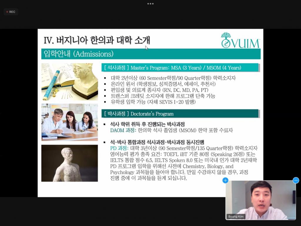 미동부 최고의 한의대인 버지니아 한의과대학교(Virginia University of Integrative Medicine, VUIM)에서 1월 봄학기를 앞두고 신입생 및 편입생을 모집하며, 입학설명회를 지난 16일 줌을 통해서 실시했다.