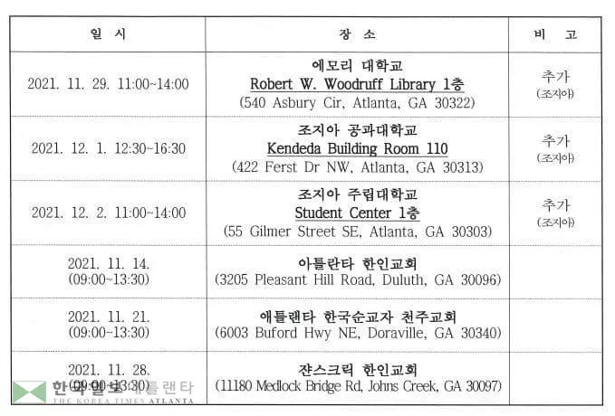 앞으로 순회 접수 일정은 매주 주말마다 둘루스H마트, 메가마트, 아씨플라자 등 한인마트와 11월 28일 쟌스크릭한인교회, 11월 29일 에모리대학, 12월 1일 조지아공과대학, 2일 조지아주립대학을 방문할 예정이다.