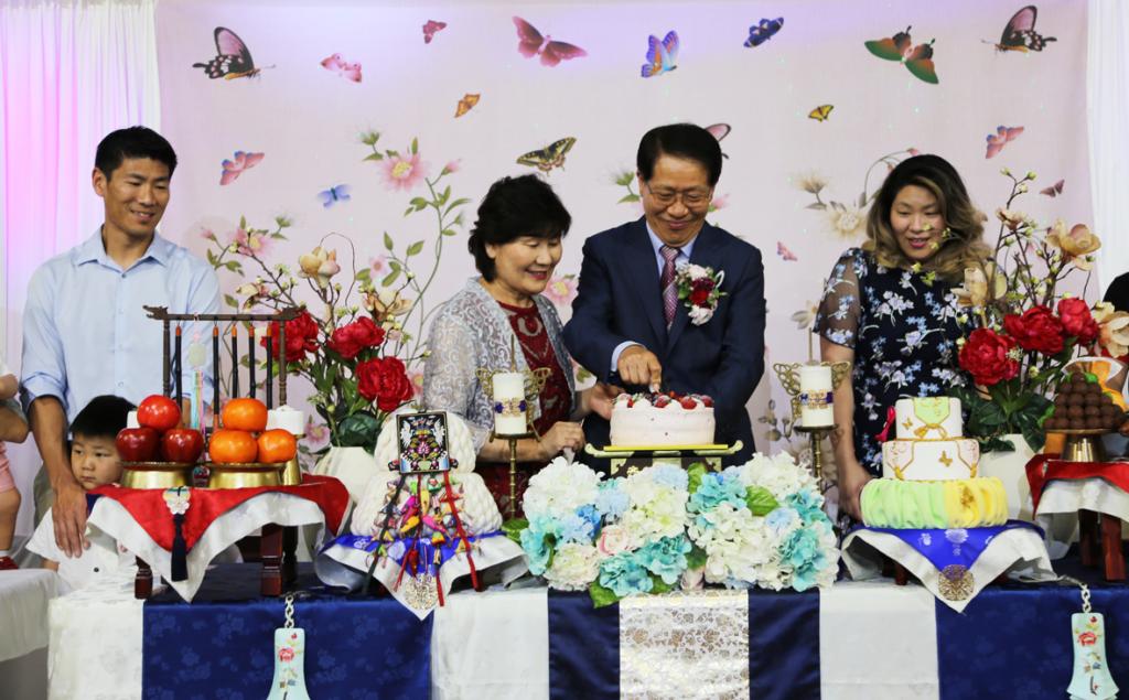 이경성 애틀랜타한인회 이사장이 26일 70세 생일을 맞아 고희연을 애틀랜타 한인회관에서 가족과 교우, 친지들 150여명이 참석한 가운데 개최했다. 이경성 이사장은 한국에서 삼성전자에서 근무하다 1989년에 도미해 애틀랜타에 23년째 살고 있으며, 동남부 충청향우회 회장을 역임하고 현재는 한인회 이사장으로, 그리고 슈가로프한인교회 장로로 섬기고 있다. 사진은 이 이사장 부부가 아들과 딸이 지켜보는 가운데 축하케익을 자르고 있는 모습. 박요셉 기자