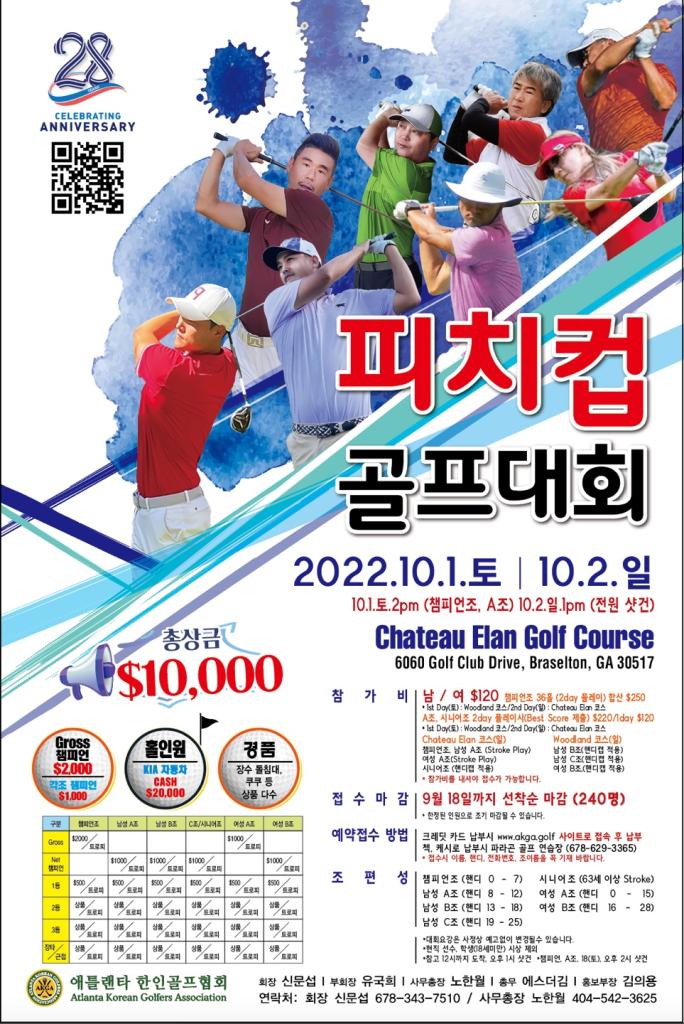 애틀랜타한인골프협회(회장 신문섭) 주최 ‘제28회 피치컵 골프대회’가 브래즐턴 소재 샤또 알렌 콜프클럽에서 10월 1일과 2일 이틀 동안 진행된다.