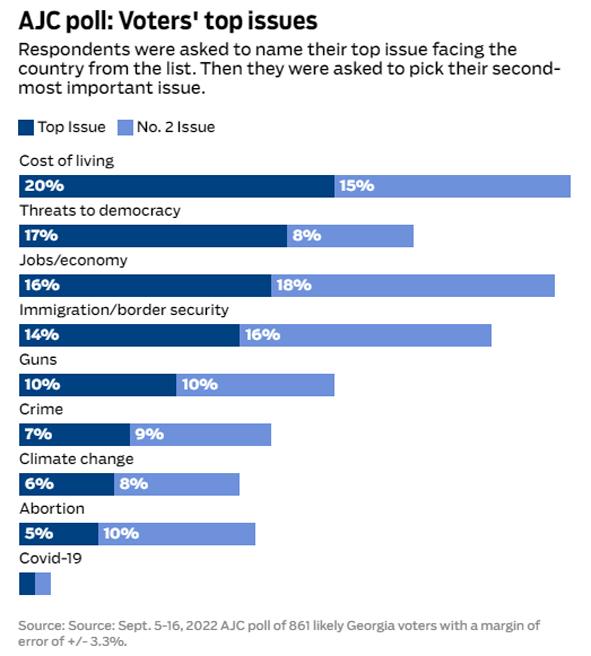 조지아 유권자들이 가장 큰 이슈로 꼽은 문제는 생활비(20%), 민주주의 위협(17%), 일자리와 경제(16%), 이민 및 국경보안(14%), 총기(10%), 범죄(7%), 기후변화(6%), 낙태(5%), 코로나19 등의 순이었다.