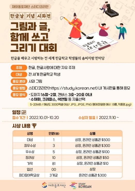 한글 또는 한글 사랑에 대한 자유 주제로 본인이 창작한 시와 손 그림으로 완성한 시화를 10월 1∼20일 재단 스터디 코리안(study.korean.net) 내 게시판에 등록하면 된다.