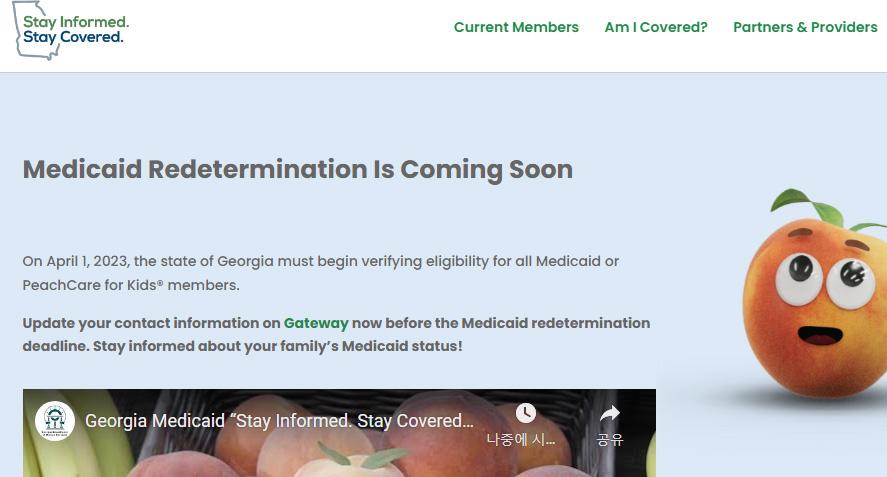 ▶모든 메디케이드 수혜자는 매년 조지아에서 자격 상태를 갱신해야 한다. 갱신 요구 사항은 대유행 기간 동안 중단됐으나 이제 부터는 갱신해야 한다.