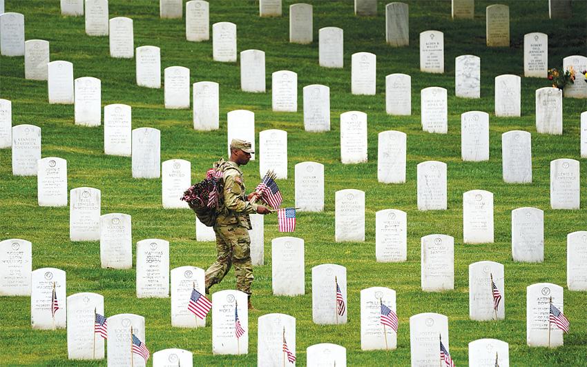 나라를 위해 목숨을 바친 호국 영령들을 기리고 추모하는 메모리얼데이를 앞두고 전국적으로 추모 분위기가 고조되고 있다. 25일 워싱턴 DC의 알링턴 국립묘지에서는 메모리얼데이에 앞서 전몰장병들의 묘지에 일일이 성조기를 꽃아 추모하는 메모리얼 전통이 이어졌다. 미 육군 제3보병연대 장병이 알링턴 국립묘지에서 전사자들을 기리는 성조기를 꽃고 있다. 〈로이터〉