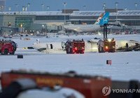 80명 탄 델타 여객기, 악천후 속 캐나다 토론토공항 착륙과정에 사고지난달 워싱턴 여객기-헬기 충돌 참사 등 최근 북미서 항공사고 잇달아 17일(현지시간) 캐나다 토론토 피어슨 국제공항에서 직원들이 여객기 사고 현장을 수습하고 있다.(토론토 AFP=연합뉴스) 17일 오후(현지시간) 캐나다 토론토 피어슨 국제공항에서 80명이 탑승한 여객기가 착륙하던 중 뒤집히는 사고로 17~18명이 부상했다.로이터 통신 등의 보도에 따르면 미국 미니애폴리스에서 승객 76명과 승무원 4명을 싣고 출발한 델타항공 자회사 엔데버에어 여객기