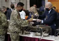 추수감사절 앞두고 군 장병들에게 배식하는 바이든 부부조 바이든 대통령(오른쪽)과 부인 질 여사(오른쪽 두 번째)가 22일 추수감사절을 사흘 앞두고 노스캐롤라이나주 포트브래그에 있는 군 기지를 방문해 장병들에게 배식하고 있다.