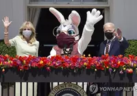 조 바이든 대통령과 부인 질 여사가 5일 워싱턴DC 백악관 사우스론의 트루먼발코니에서 부활절 토끼 인형인 '이스터 버니'(중앙)와 함께 손을 흔들고 있다. 매년 백악관에서 성대하게 펼쳐지던 부활절 달걀 굴리기 행사는 신종 코로나바이러스 감염증(코로나19) 확산 방지를 위해 취소됐다.<연합뉴스>'부활절 토끼 인형'과 함께 손 흔드는 바이든 부부
